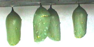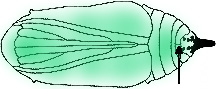 This picture of a Pupae depicts the faint outlines of the outer skin of the caterpillar as it changes into a butterfly. All the bodyparts are already outlined as it turns from caterpillar to chrysalis. The arrow points to one tiny extra line that runs vertically as a pupae hangs, this line tells us it will be a female. Use a magnifying glass! Another easy hint is the female chrysalis is usually smaller too. Always be very gentle when handling delicate Pupae. |